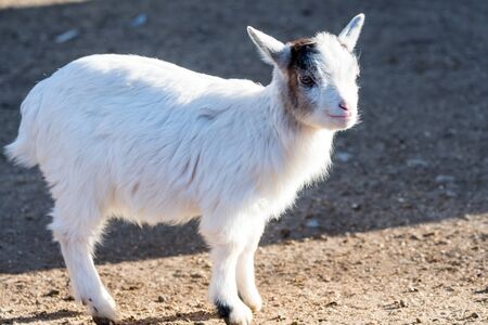 Cute little white goat looks at camera. Funny pets.