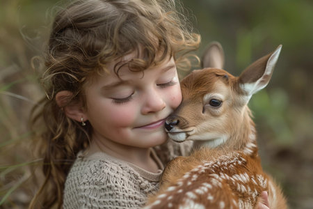 In this heartwarming scene, a curly-haired young girl shares a tender moment with a newborn fawn among tall grasses. The close-up captures the affection and gentle interaction between child and wildlife, ideal for illustrating compassion and care in nature.