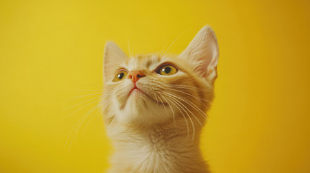 This charming cat features soft whiskers and a curious expression, set against a vibrant yellow background, embodying playfulness and warmth.
