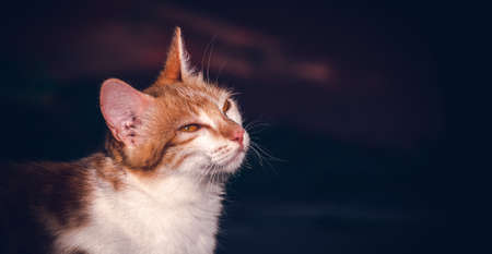 Cat with striking orange and blue lighting on face, close-up portrait in darkness. Dramatic feline gaze in studio light, artistic photography concept
