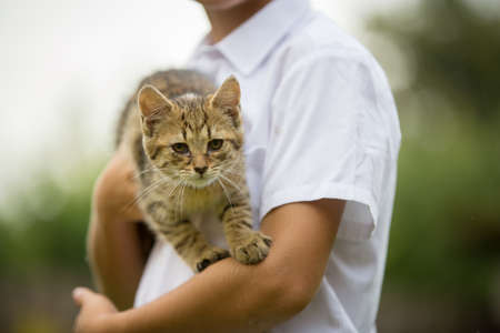 Ginger kitten in the hands of the boy. Homeless, sad. Pets. Animal love. Human-animal relations, help to animals.