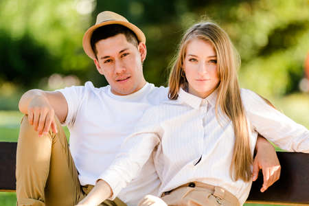 Portrait of happy young couple sitting on a bench in the park