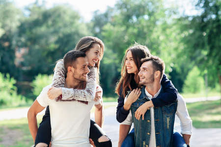 Two loving couples piggyback having fun outdoors. Girls sitting on back of guys smiling. Young women and men playing in park, and looking at each other