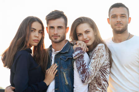 Portrait of 20s young friends having fun together and watching the camera. Outdoor shot at sunset time in the seaside
