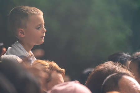 A beautiful close up of a little boy sitting on his father's shoulders surrounded by people
