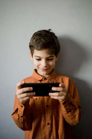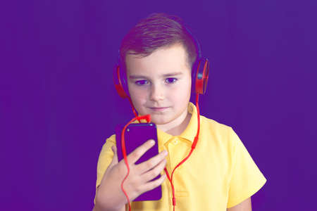 Close up of one young school boy using his phone and listening music alone or watching videos.Purple foggy toned background.