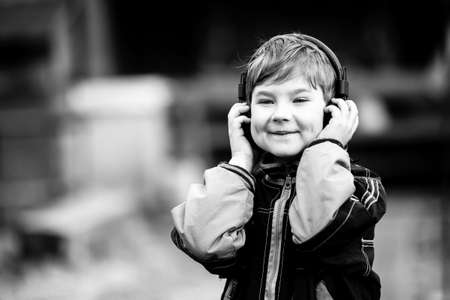 Little boy enjoying music with headphones, outdoors. Black and white photo.