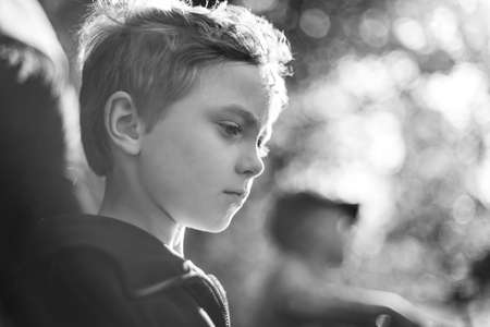 Side portrait blond serious boy with freckles frowns wrinkles nose, artistic emotions facial expression gesturing. Family relationship, micro moments of childhood, compassion toward humanity, society