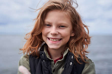 Portrait of happy laughing child boy on the beach. Kid smiling outdoors on the autumn winter beach