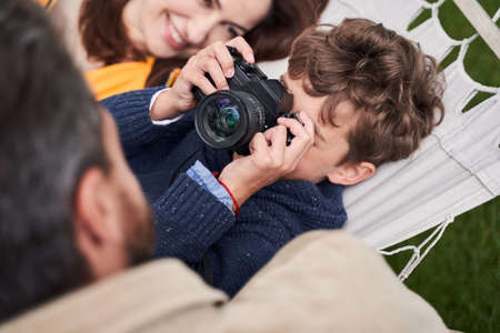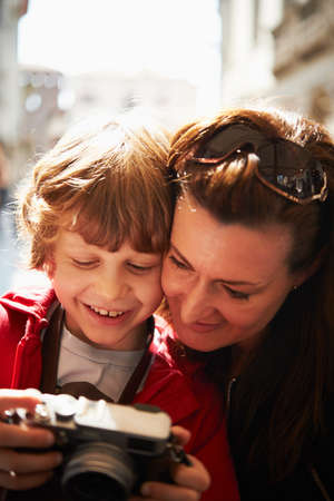 Mother and daughter taking photos and checking them on a modern digital DSLR camera