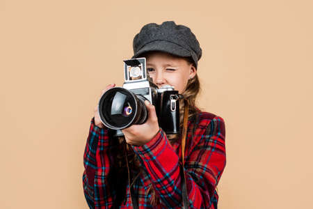 teen girl with retro photo camera wear trendy hat and checkered jacket, vintage photography