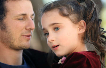 A man is sitting and reading a newspaper to his young daughter, A father and daughter looking at old family photos together