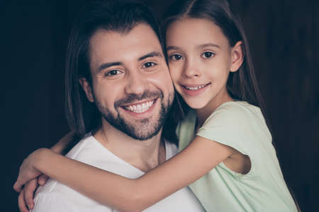 Closeup photo of beautiful little adorable lady and her handsome young daddy hugging dreamy toothy smiling spend weekend time homey domestic house room indoors