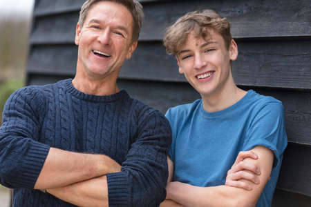 Portrait shot of an attractive, successful and happy middle aged man father male arms folded with his teenage boy son outside laughing teen, wearing a blue sweater and t-shirt