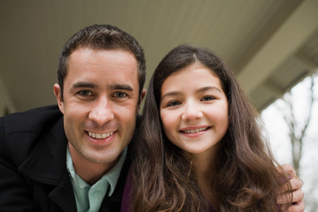 holidays, children and family concept -asian outdoor portrait of dad with his teen daughter