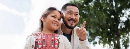 Low angle view of smiling asian man pointing with finger near daughter in park, banner
