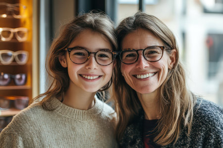 A smiling mother helps her daughter pick out eyeglasses at an optical shop, highlighting care, vision, and family connection.