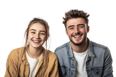 Happy young man and woman smiling at camera. Real people feeling joy and togetherness on a white background