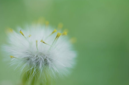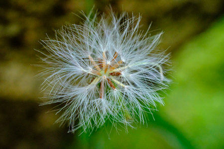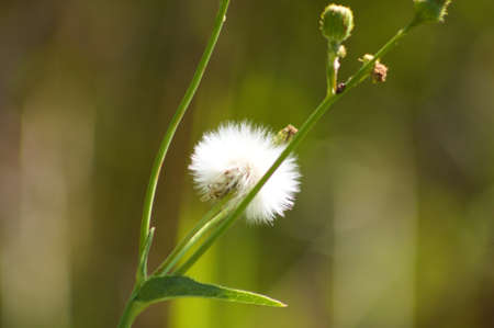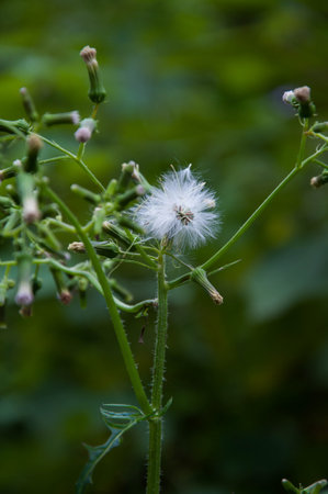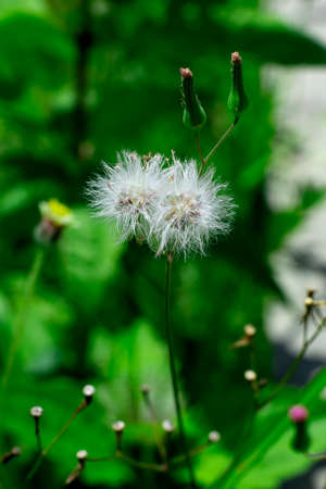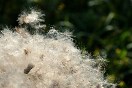 Close-up of fluffy common sowthistle seeds with green blurred plants on background