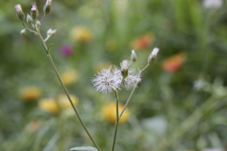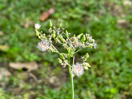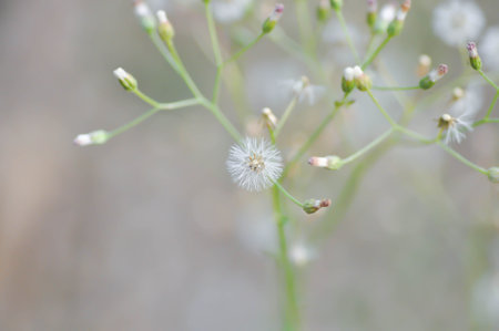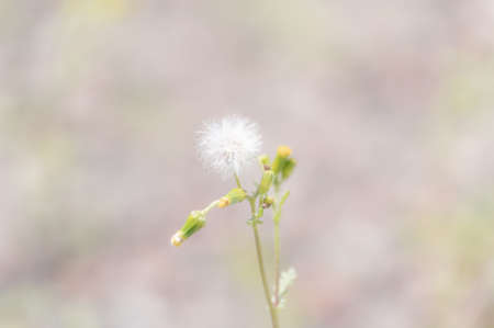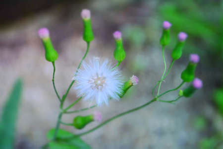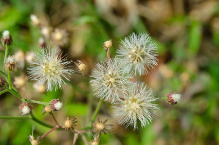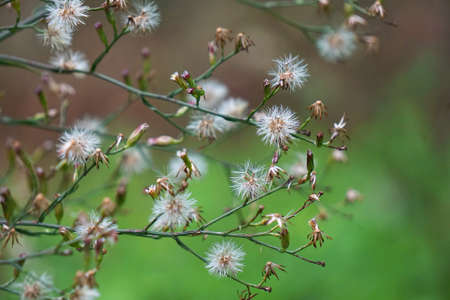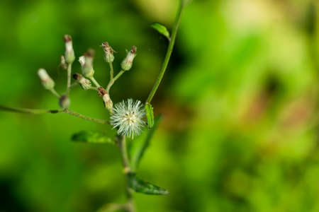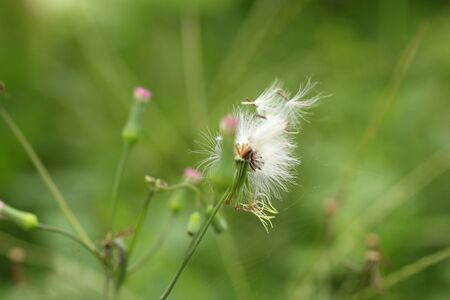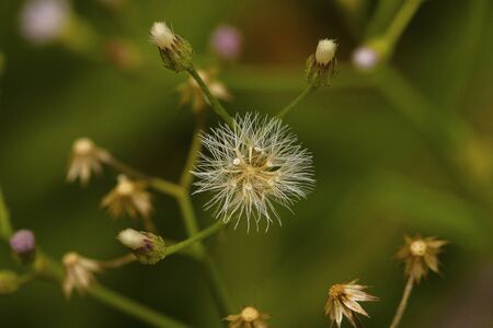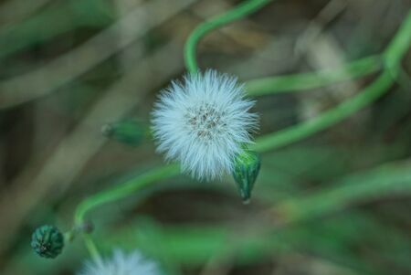 Flower in grass. White grass flower blown off and flower buds. Life and nature process concept.