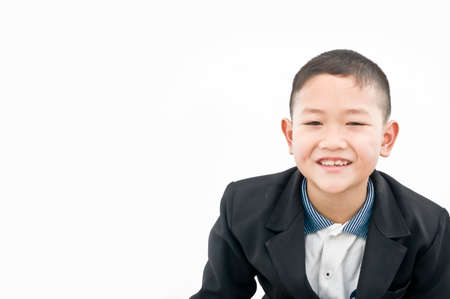 Asia boy child face smile and laugh look away camera head shot portrait with copy space