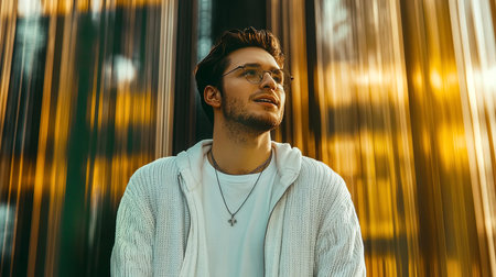 Hipster stylish young man with hairstyle and fashion glasses in a trendy blue sweatshirt stands hand in hand near the white wall on the street and looks