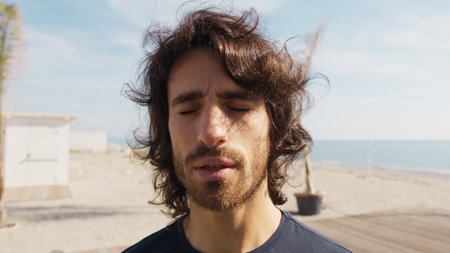 Caucasian man enjoying his time at the beach with his friends on a sunny day, with his eyes closed