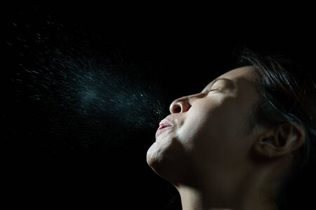 Woman coughing or sneezing. Concept of spread of the virus. Spray infection