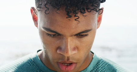 Sweat, fitness and face of woman in city for rest, break and breathe after running, workout and exercise. Sports, endurance and person in town with intense training for wellness, health and challenge