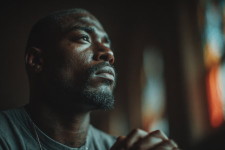 Thoughtful African American man is gazing into the distance with a contemplative expression, hands clasped together, illuminated by soft light from stained glass windows