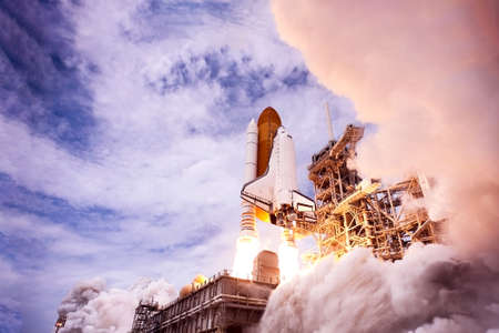 Space Shuttle Launch. With fire and smoke. Against the background of blue sky. Elements of this image were furnished by NASA. For any purpose.