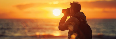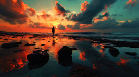 Top-down view of philosopher at cliff's edge serene ocean and tranquil sunset
