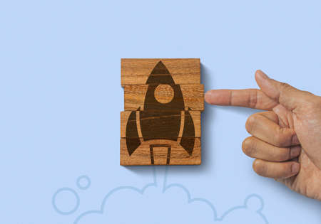 Hand putting the last piece of wooden blocks with launching rocket graphic icon on blue background. Business start up, start, new project or new idea concept.