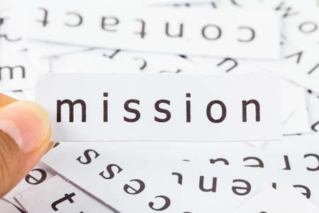 mission word abstract in vintage letterpress wood type against blue textured paper - important goal, business, military or religion concept