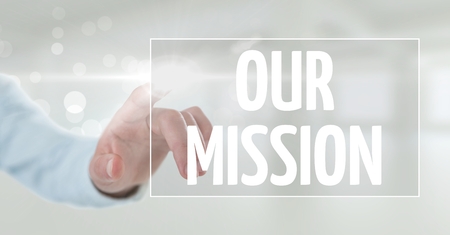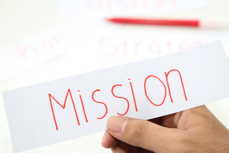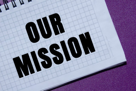 Our mission message written on notebook page on purple background. Conceptual our mission symbol. Copy space.