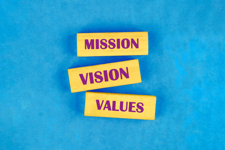 Business mission vision values concept. Copy space. Concept words Mission Vision Values on blocks made of wood, top view Conceptual photo