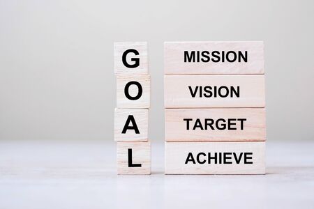 GOAL text wooden cube with Mission, Vision, Target and Achieve blocks on table background. Business concept
