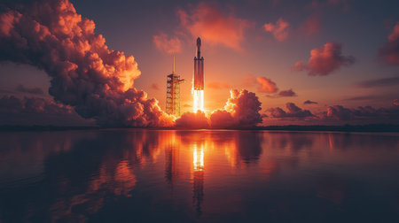 Powerful rocket launch ascending into the sky during a vibrant sunset with reflection on the water surface.