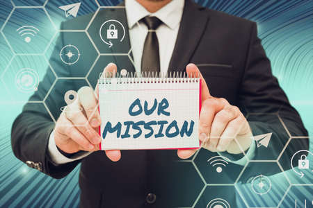 Text caption presenting Our Mission. Concept meaning tasks or schedule we need to made them right in order success Businessman in suit holding notepad symbolizing successful teamwork.