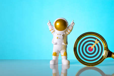 Astronaut and magnifying glass with dartboard symbol. Winning, victory and successful concept.
