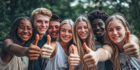 Group of young people showing thumbs up and smiling at camera in the park