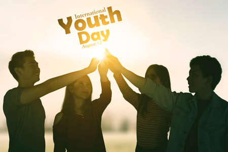 Group of multiracial people giving high five together while standing with International youth day text