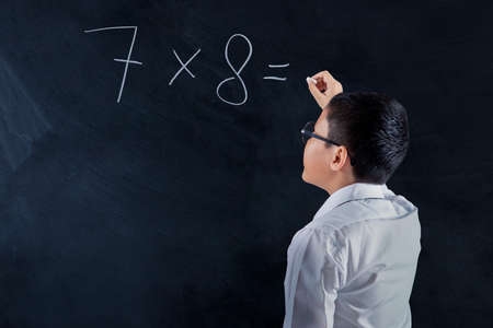 Side view of an adorable Asian boy wearing school uniform while solving a division calculation in a classroom