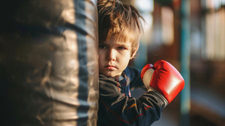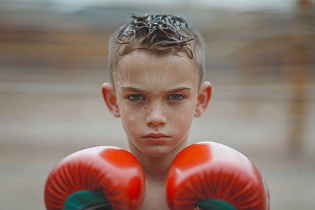 A young boy showcases his determination and strength while wearing boxing gloves in an outdoor training environment, embodying the spirit of athleticism and focus.