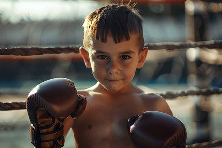 A young boy with brown boxing gloves stands confidently in the ring, ready for a match, with a determined look on his face.