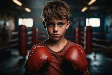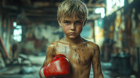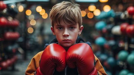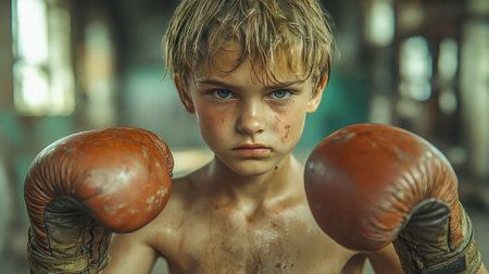 A young boxer stands in a rustic gym, focused and ready to train. His determined expression and boxing gloves signal dedication and readiness for the challenges in the sport.
