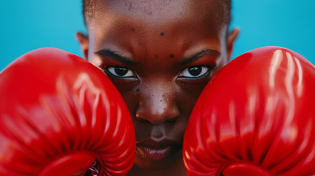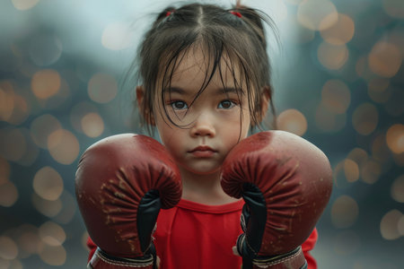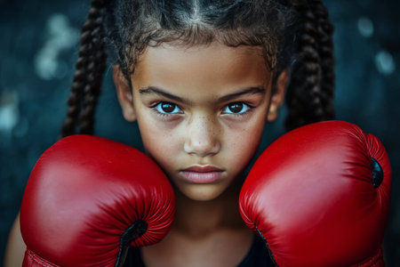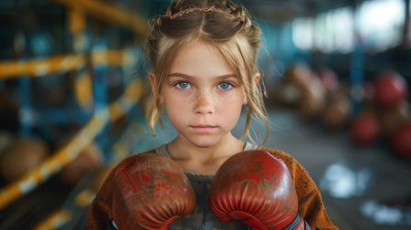 A young girl, focused and serious, wears red boxing gloves while training in a worn gym. Her braided hair frames her determined face, ready to take on any opponent or challenge ahead.