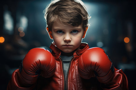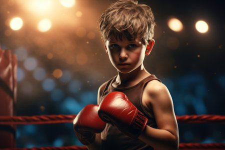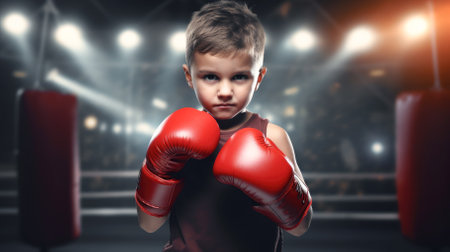 Fearless Little boy boxing ring. Art fitness punch. Generate Ai