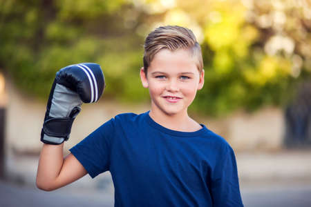 Kid boy with boxing gloves showing strong outdoor. Childhood, leisure and and health concept