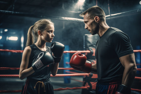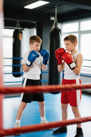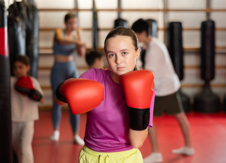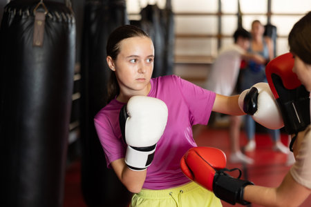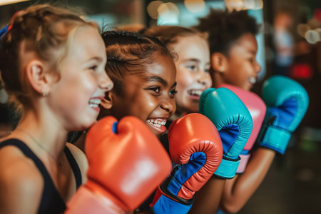 Young girls in boxing gloves show enthusiasm for the sport and growth as athletes during gym training. Their smiles reflect dedication and passion